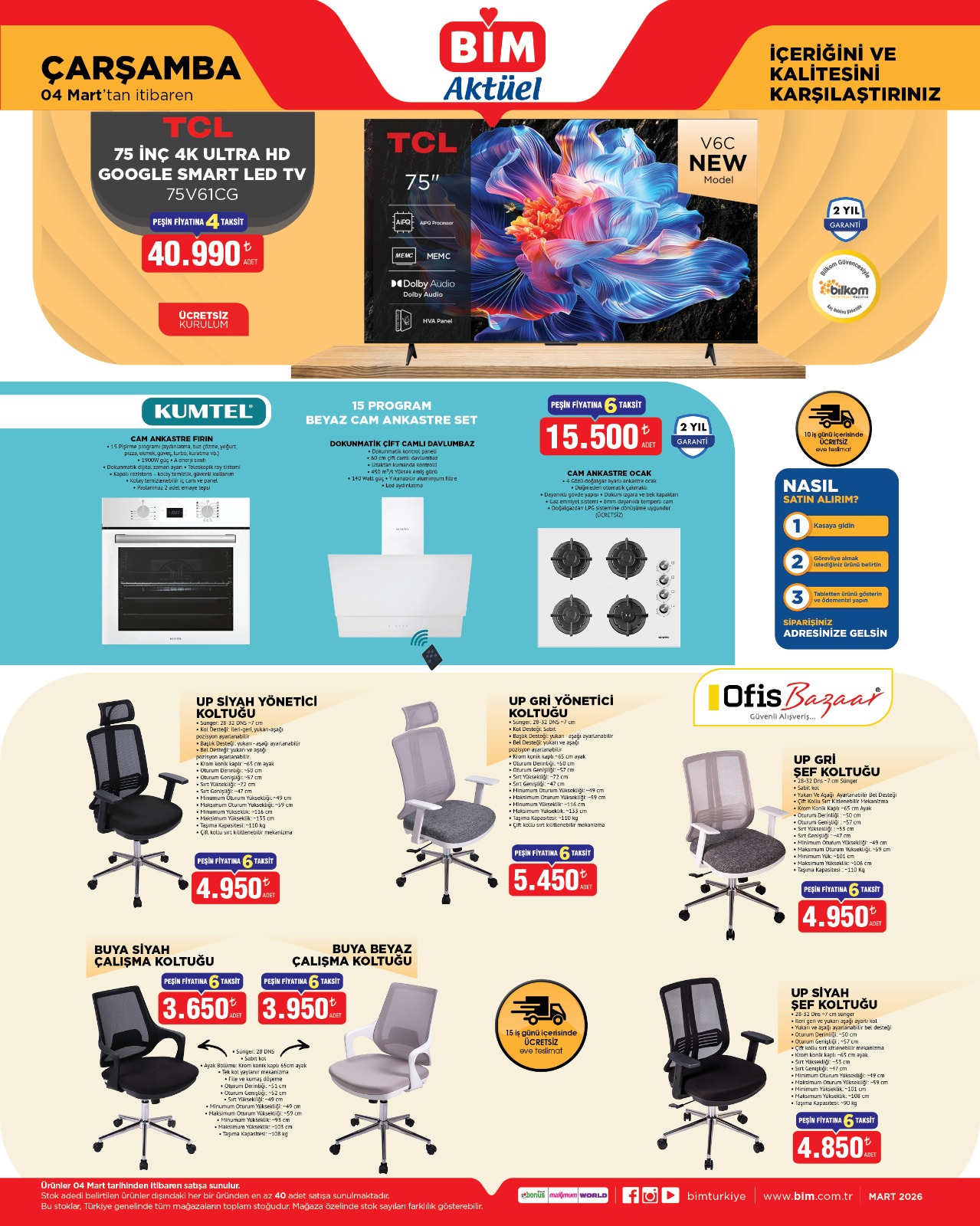 BİM, 4 Mart Çarşamba günü başlayacak yeni aktüel kampanyasını duyurdu. Kampanya kapsamında 75 inç TCL 4K Google Smart TV, ankastre set ve ofis koltukları gibi birçok ürün avantajlı fiyatlarla satışa sunulacak.