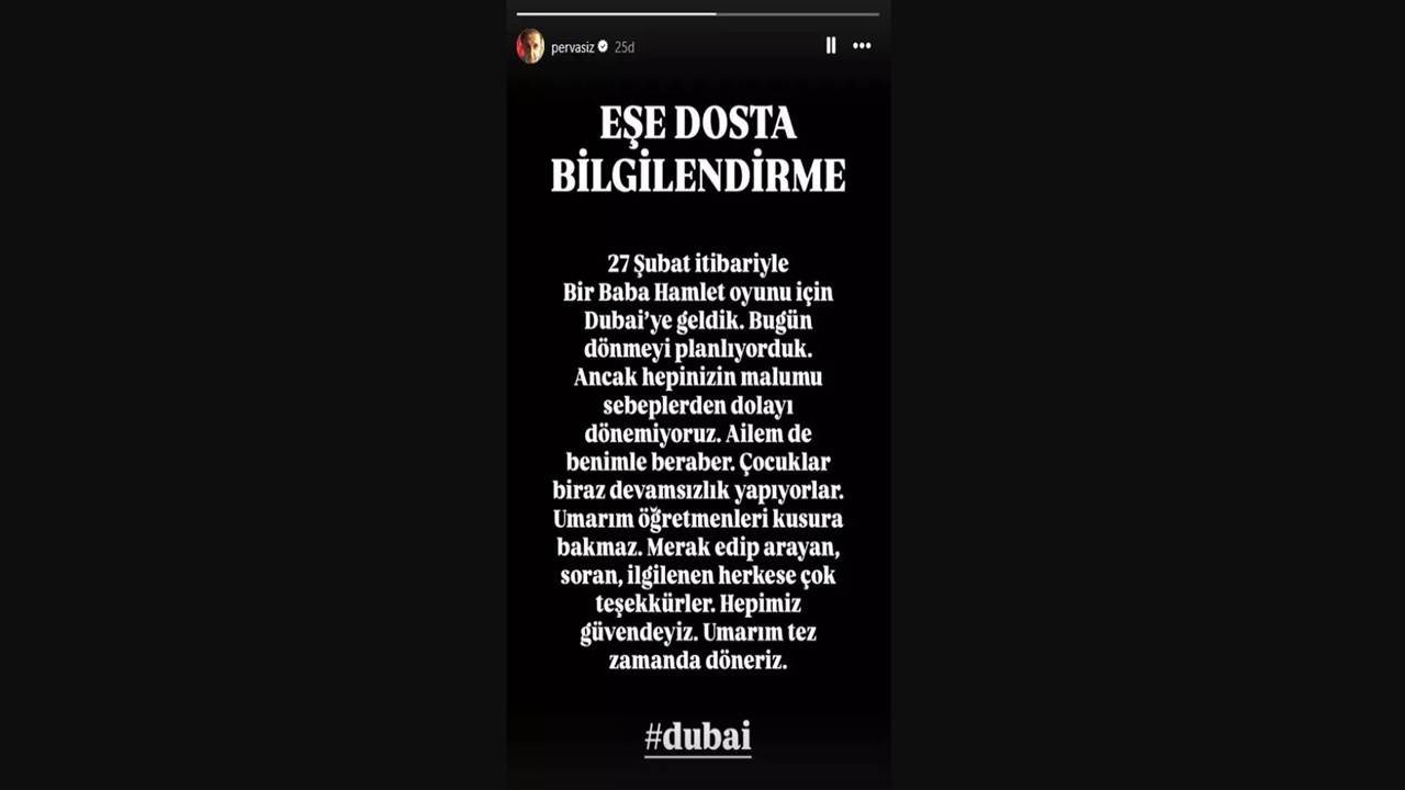 Dubai’de “Bir Baba Hamlet” oyunu için bulunan İlker Ayrık da sosyal medya üzerinden açıklama yaptı. Ayrık, “Bugün dönmeyi planlıyorduk ancak malum sebeplerden dolayı dönemiyoruz. Ailem de benimle beraber. Hepimiz güvendeyiz. Umarım en kısa sürede döneriz” ifadelerini paylaştı.