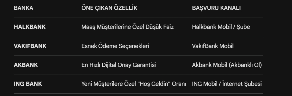 Halkbank, Vakıfbank, Akbank ve ING, başvuru süreçlerini tamamen yapay zeka destekli dijital kanallara taşıdı. Mobil uygulama veya internet bankacılığı üzerinden yapılan başvurularda T.C. kimlik numarası ile yapılan sorgulama, saniyeler içinde “Onay” veya “Red” sonucunu veriyor. Onaylanan tutar, ıslak imzaya gerek kalmadan anında vadesiz hesaba aktarılıyor.